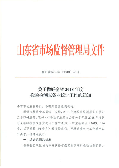 關(guān)于做好全省2018年度檢驗檢測服務(wù)業(yè)統(tǒng)計工作的通知(魯市監(jiān)科認(rèn)字[2019]80號)